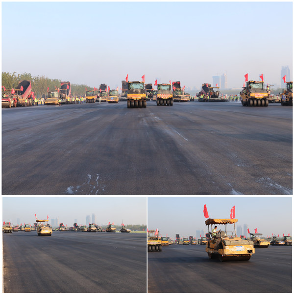 此次施工共生产约6000吨AC-10普通型沥青混合料,本次主跑道沥青上面层修复施工长度1502米,路面宽度60米,同时使用8台摊铺机,每台摊铺机搭配2台钢轮1台胶轮进行摊铺工作,60米全幅路面一次性施工成型,施工面积约90120平方米,将为2023年园博会的举办提供便利的行车通道和展览场所。