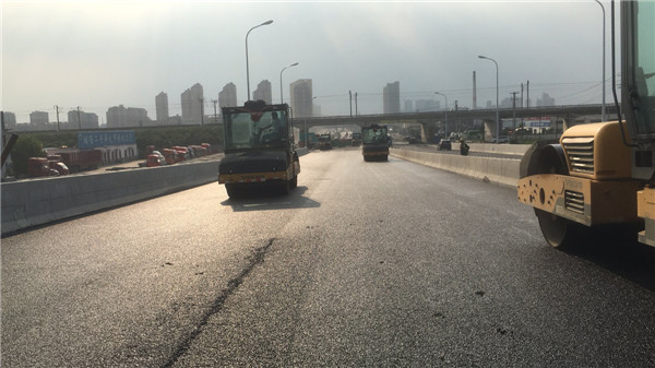 本项目是合肥市重点建设管理局工程,位于安徽省合肥市肥东县,该项目位于影香亭路至桥头集路段匝道桥,全长约2.09公里,宽度50米,主线采用城市快速路标准,设计为双向6车道,设计速度80公里/小时,地面采用城市主干路标准,双向6车道,设计速度50公里/小时。该高架项目沥青砼结构层为桥下主车道上面层4cm SMA-13改性沥青玛蹄脂,中层6cm AC-20C改性,下面层8cm AC-25C,桥上道路沥青砼为上面层4cm SMA-13改性沥青玛蹄脂,下面层6cm AC-20C改性。截止目前,该项目已完成桥下主车道底、中层和主桥桥面下面层的沥青混合料摊铺工作,为该项目按时完成奠定了良好的基础。