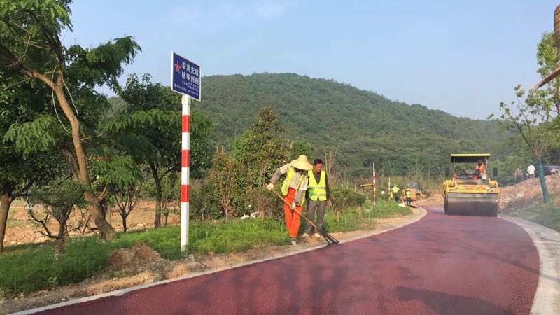 该工程所用的彩色透水沥青,又名彩色胶结料,具有排水降噪等特点,可有效美化城市环境,目前广泛应用于标志性道路、人行道、小区道路、公园、广场、停车场等景观铺装。