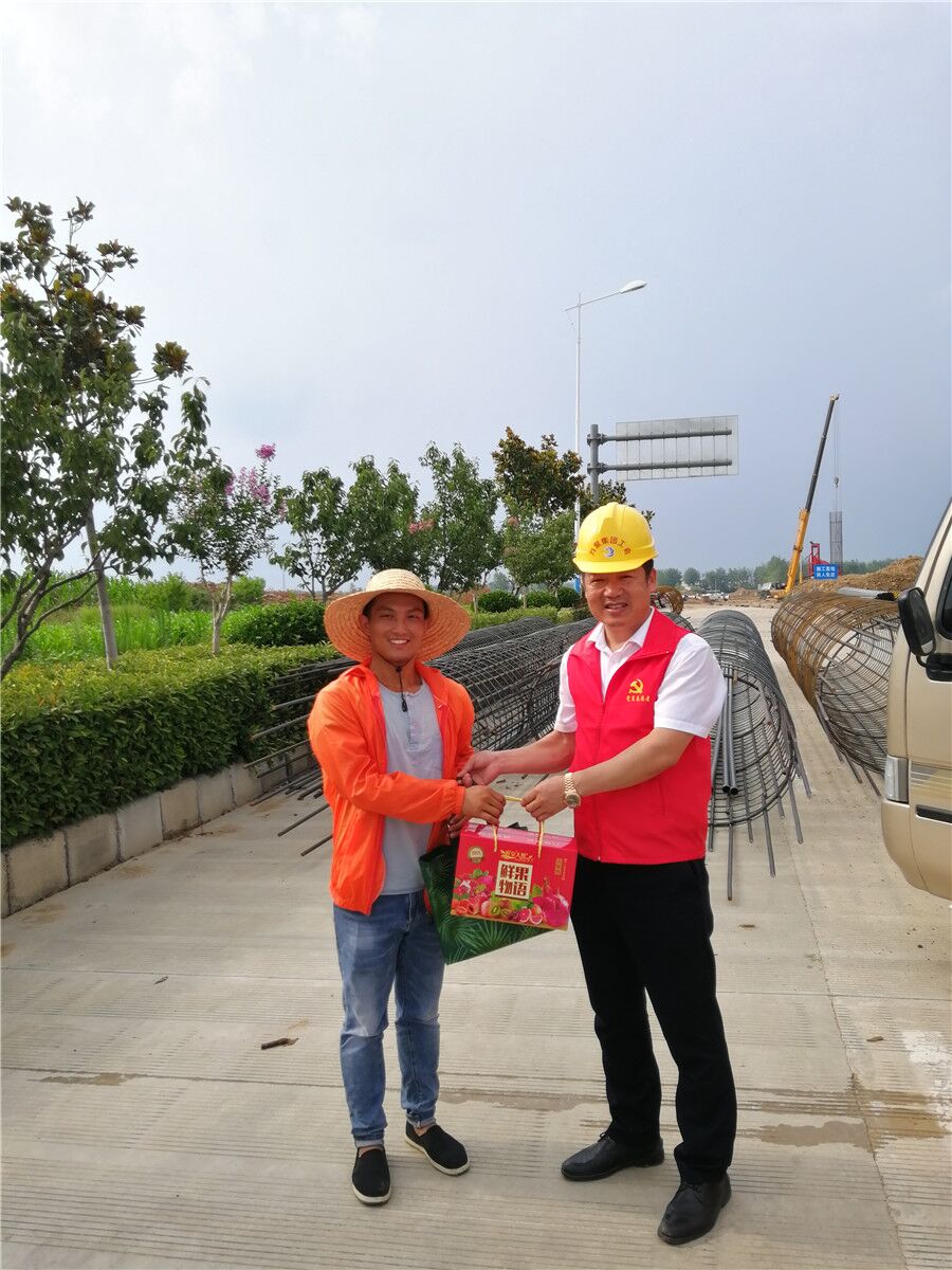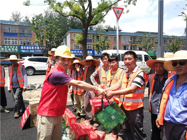 7月31日,集团分管领导武勇及聚兴市政总经理卫永培前往施工一线,亲自将防暑药品及饮品发放到员工手中;