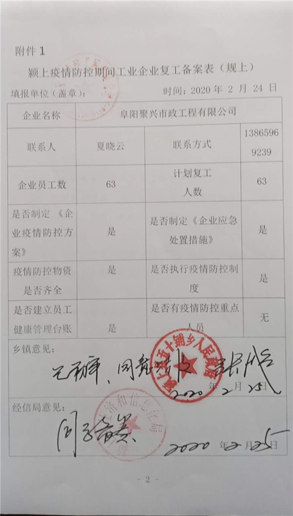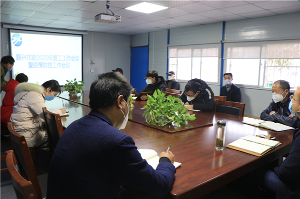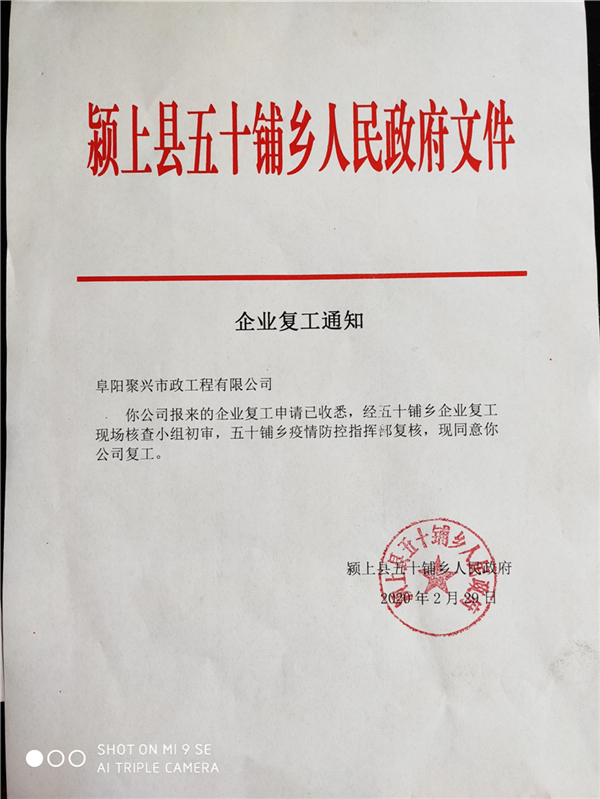 聚兴市政通过前期一系列完善准备工作,得到了上级主管部门的认可,于2月29日正式取得颍上县五十铺乡政府复工审批文件,3月2日正式组织了部分员工有序开始复工,同时3月2日下午,聚兴市政总经理卫永培主持召开了复工工作会议暨疫情防控指导会议,副总周雄、部分复工员工参加此次会议。