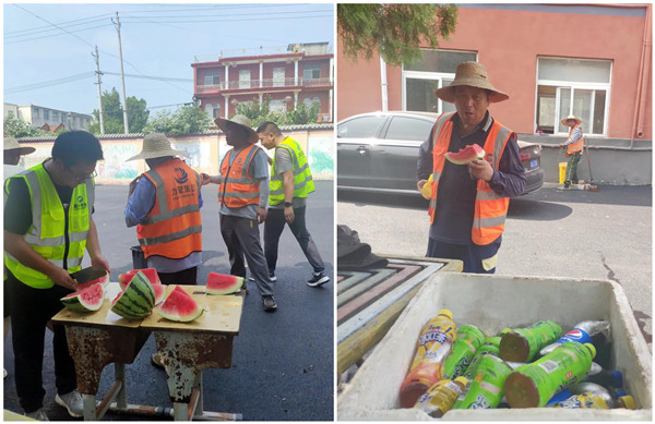 后场工作人员带来了解暑的西瓜和饮料,在休息的时候,大家一起切着西瓜、喝着饮料,开心的笑容荡漾在所有人的脸上。看着日益发达的城市交通路网,里面浸透着力聚人为之挥洒的汗水,烈日酷暑下的辛勤付出,此刻都化为灿烂的笑容。