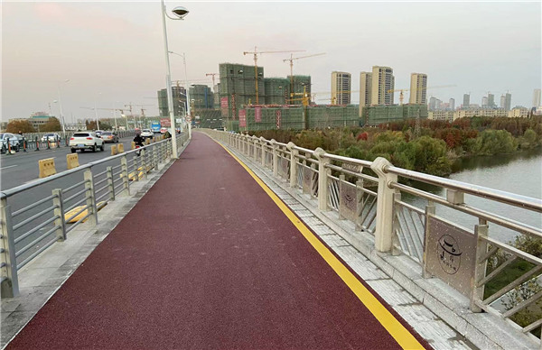 滁州市明光路大桥是滁城重要的东西向交通要道,原人行道是花岗岩人行道板砖。该桥没有非机动车道,人行道上行人和非机动车混行,且车流量非常大,致使花岗岩人行道板砖经常损坏。