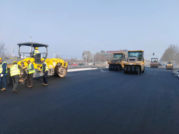 我司主要负责该项目主路沥青砼摊铺施工,道路总设计厚8cm+6cm+4cm,沥青透层,下面层为8cm粗粒式沥青混凝土AC—25C,中面层为6cm中粒式改性沥青混凝土AC-20C(+0.3%抗车辙剂),上面层为4cm细粒式改性沥青混凝土AC—13C(玄武岩)。
