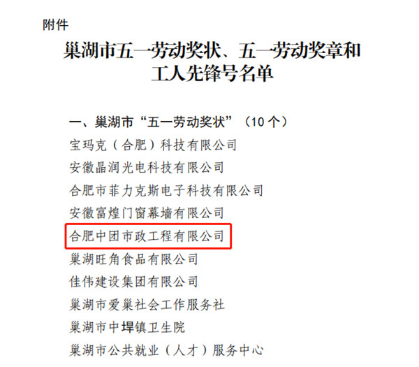 当好主力军,绽放劳动美。近日,巢湖市总工会下发通报,公示了2022年度巢湖五一劳动奖名单,力聚集团合肥中团市政工程有限公司荣获“巢湖五一劳动奖状”。