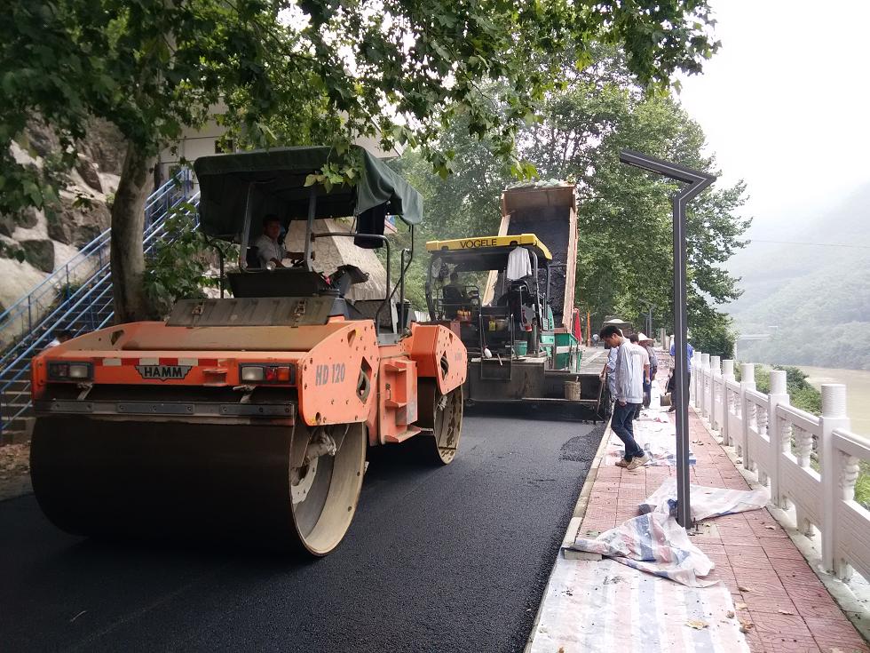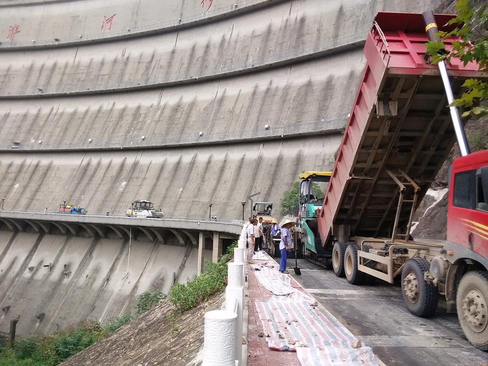 江城自打开金寨市场,先后承接梅山湖路与响洪甸水库沥青道路摊铺项目,响洪甸水库是淮河支流西淠河上的一座大型水库,20世纪50年代新中国治理淮河水患的枢纽工程之一,毛泽东曾在一年中四次批示"治淮",并于1951年题词:"一定要把淮河修好",是以防洪灌溉为主,结合发电、城市供水、航运、水产养殖等综合利用的大型水利水电工程。响洪甸水库也是金寨地区的重要旅游圣地,它是我国自行设计和施工的第一座等半径同圆心混凝土重力拱坝,又由于是圆心坝,整条路面成环形,大型摊铺设备不能自由发挥,这给我站的摊铺工作带来难度,针对这点,我站调动充足的人力,辅助摊铺,力争将环形路面做到完美。将美丽的响洪甸水库道路修好,打造成江城市政在金寨地区的口碑工程,是我们江城人近期的重要任务。