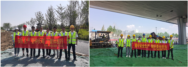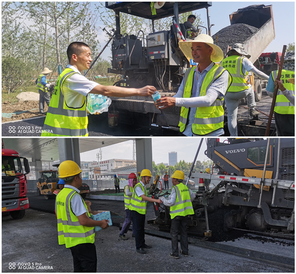 六月是全国的安全生产月,也是安徽的梅暑季节,热浪滚滚,酷暑难耐。广朋党支部深入结合集团各子公司当下的实际生产与施工情况,精心组织、提前筹备,在卫书记的带领下分别来到位于原合肥骆岗机场的中央公园园博园盛峰市政项目工地和金寨路快速化改造强顺市政项目工地,两处项目现场正在进行该标段的AC-20和AC-25施工。党小组成员按照分工安排分别对施工现场的班组工人、机械设备、作业环境进行了施工安全宣贯、设备状态检查和防暑降温叮嘱,同时在现场为各班组工人送上了西瓜、冰水等物品,让工人们能够休歇消暑,为热火朝天的施工现场带来一丝清凉动力。