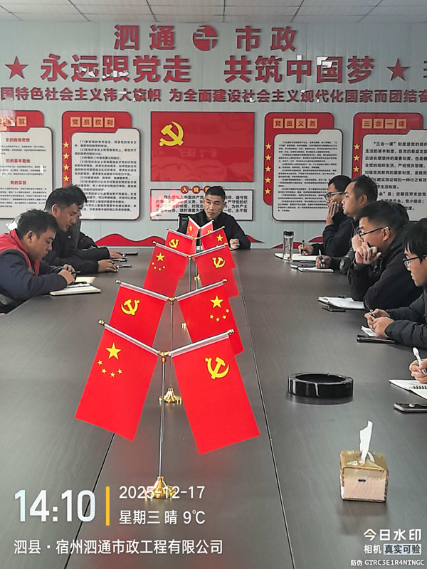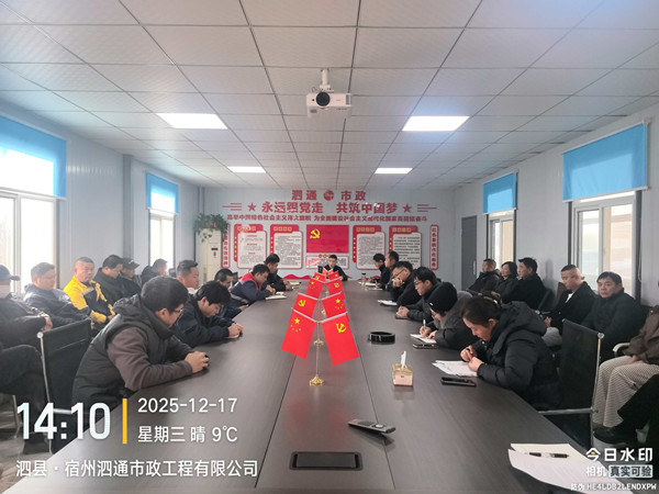 2025年12月17日下午2:00,泗通市政召开12月份工作会议。会议由总经理黄必新主持,副总经理毕杰明、陈海峰,各部门全体员工、运输车队及民工队代表参会。