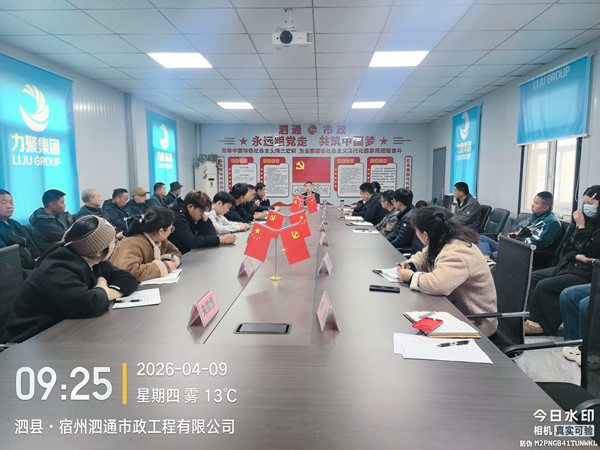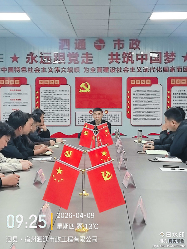 2026年4月9日上午9时,泗通市政召开月度工作例会,会议由总经理黄必新主持。副总经理毕杰明、陈海峰,各部门全体员工,以及运输车队和民工队代表共同参会。