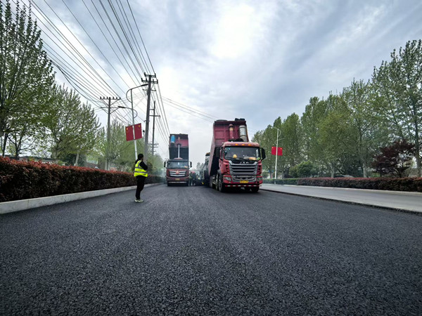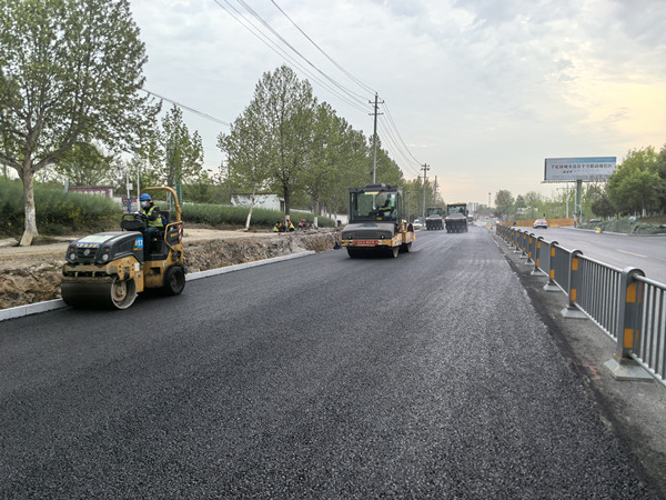 我司承接该工程沥青路面施工工作,含沥青砼生产、运输、摊铺、碾压、成型等。主道施工用料为8cmAC-25C+6cmAC-20+4cmAC-13改性玄武岩,辅道施工用料为5cmAC-20C+4cmAC-13C,人行道用料为5cmAC-13C红色(蓝色)。全长约9.99㎞。